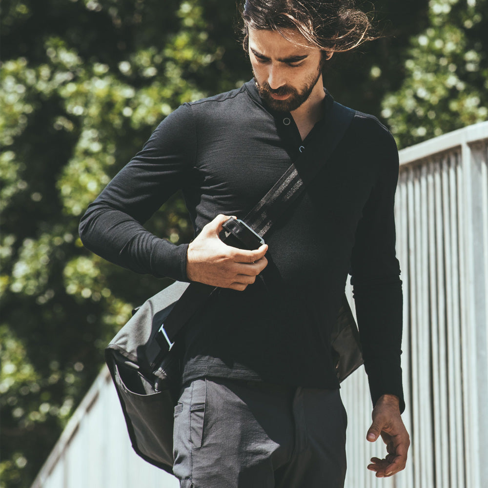 De tas heeft meerdere draagopties: verborgen handgrepen, een afneembare, snel verstelbare schouderriem en voor momenten dat de lading zwaar is, een optioneel rugzakharnas dat apart kan worden besteld. Bovendien kan de tas veilig worden bevestigd aan een voordrager.