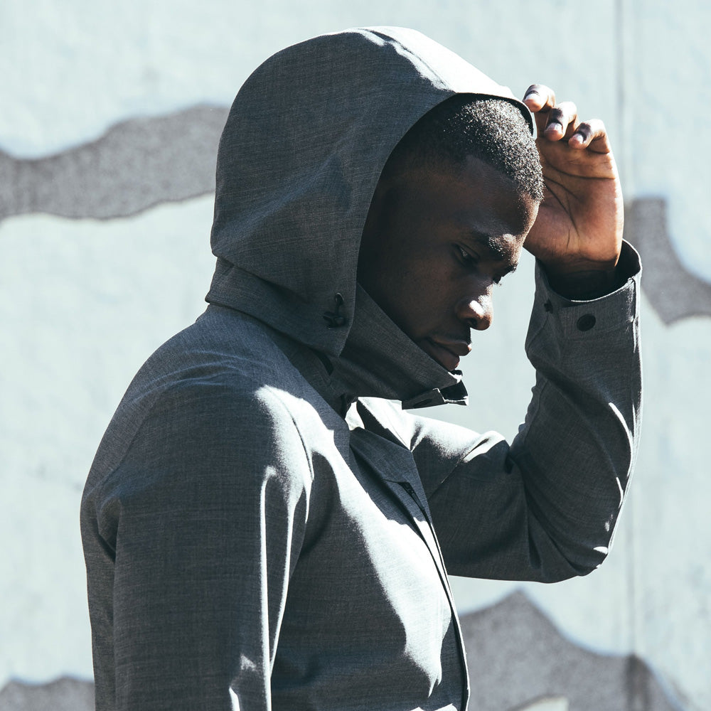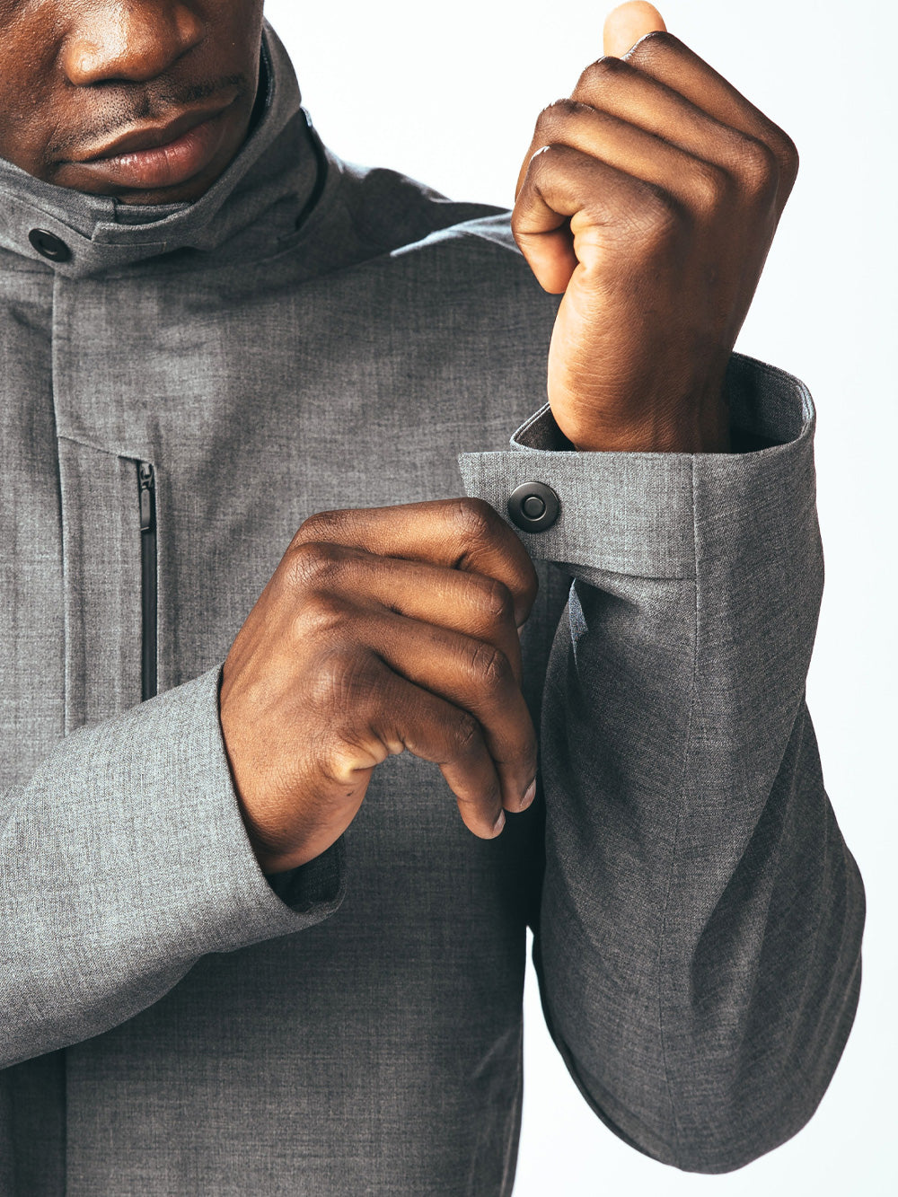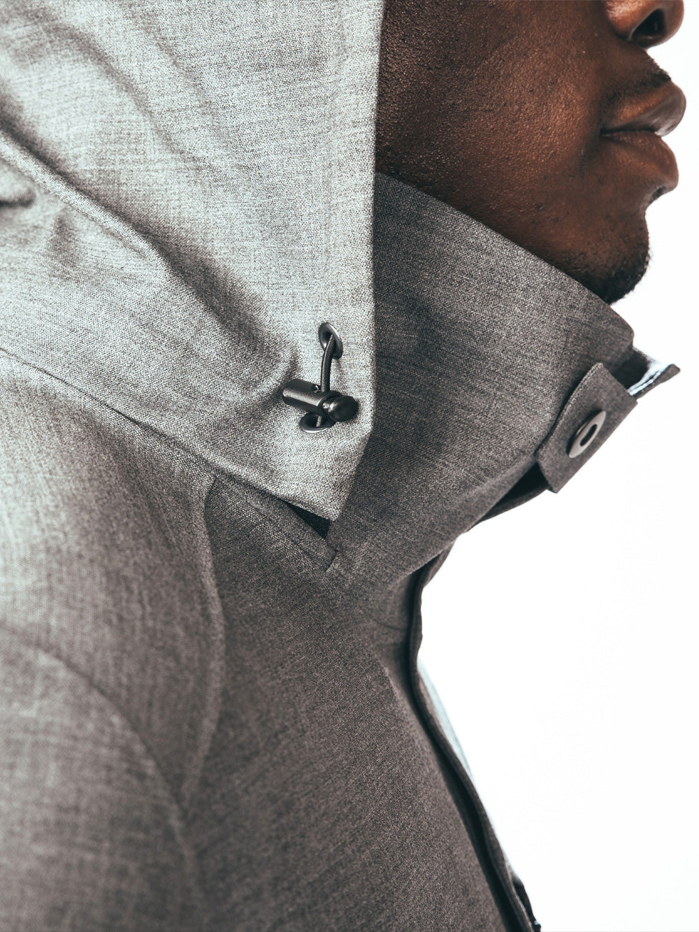 De antracietkleurige, grijze en lichtgrijze versies van de Styrman zijn gemaakt van Schoeller® c_change® stof met een glad, klassiek wollen oppervlak. De marineblauwe versie is gemaakt van Italiaanse Como stof met een verfijnde en licht gestructureerde wollen voorkant.