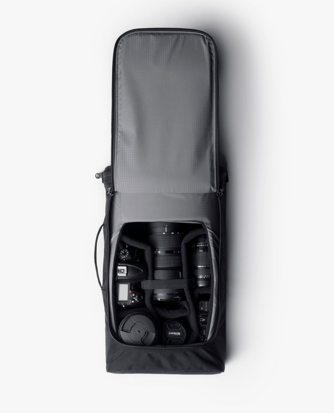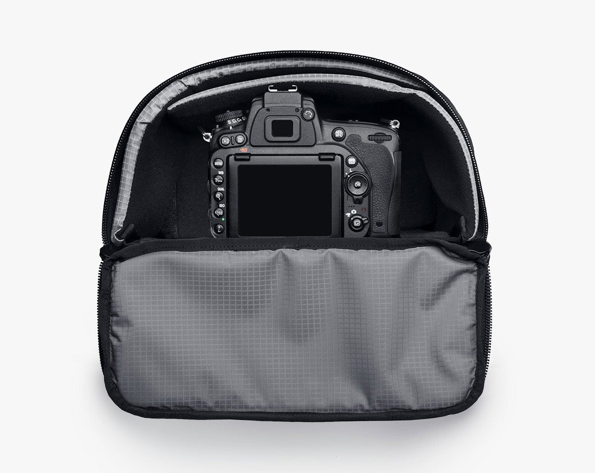 De spullen in de Capsule zijn toegankelijk via het bovenpaneel of het voorpaneel. Het bovenste gedeelte is speciaal ontworpen voor een DSLR of spiegelloze body met bijna elk formaat lens die direct toegankelijk is zonder dat je de Capsule uit je tas hoeft te halen.