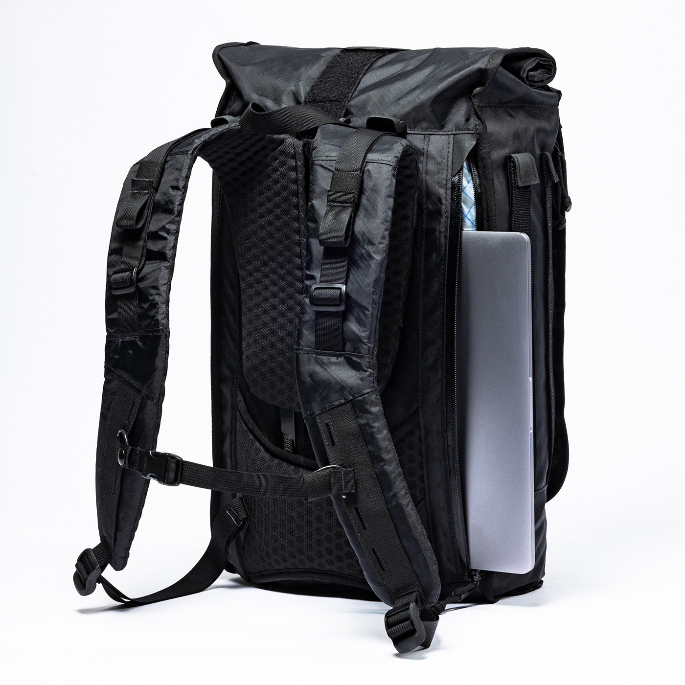 In het externe, waterdicht gevoerde laptopvak past een MacBook Pro van maximaal 16 inch. De bodem van het laptopvak komt boven de bodem van de tas uit en creëert zo een valse bodem zodat je laptop nooit in contact komt met de vloer.