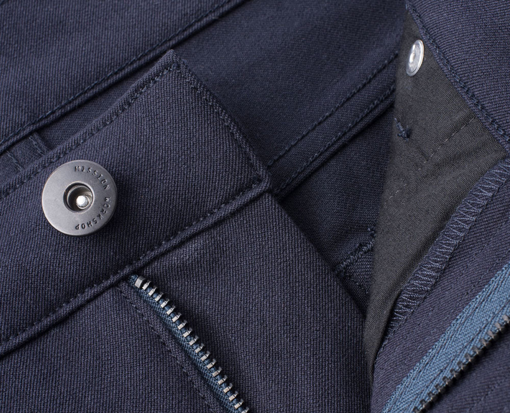 De Mission Jean is niet gemaakt van traditionele indigo denim. In plaats daarvan wordt gebruik gemaakt van een geavanceerd stretchweefsel dat exclusief voor Mission Workshop is ontwikkeld door Mectex M.I.S. in hun fabriek aan het Comomeer in Italië. Deze stof bereikt een extreem hoog niveau van 4-weg stretch zonder aan duurzaamheid of structuur in te boeten.